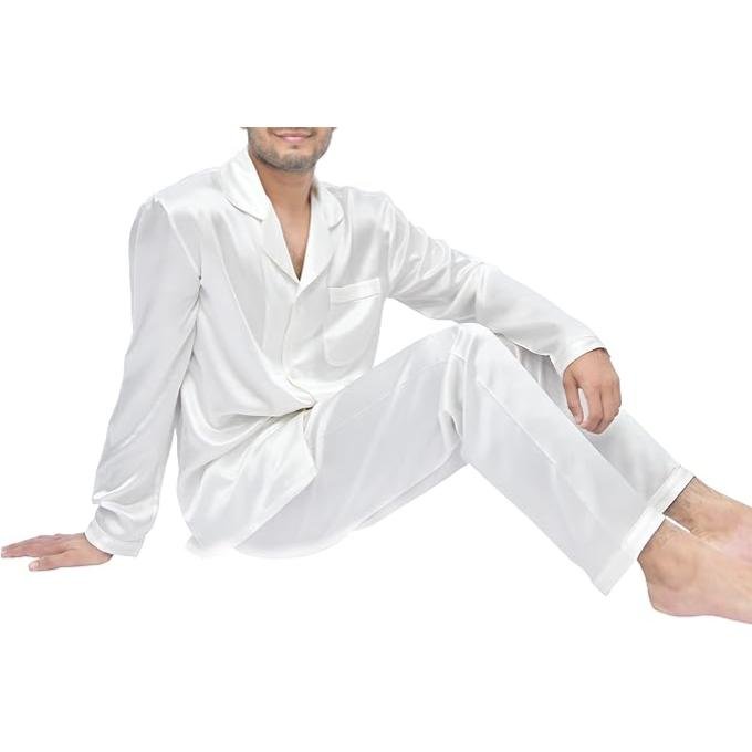 بيجامة رجالي ستان، لون أبيض، قميص بأزرار وبنطلون، مريحة للنوم