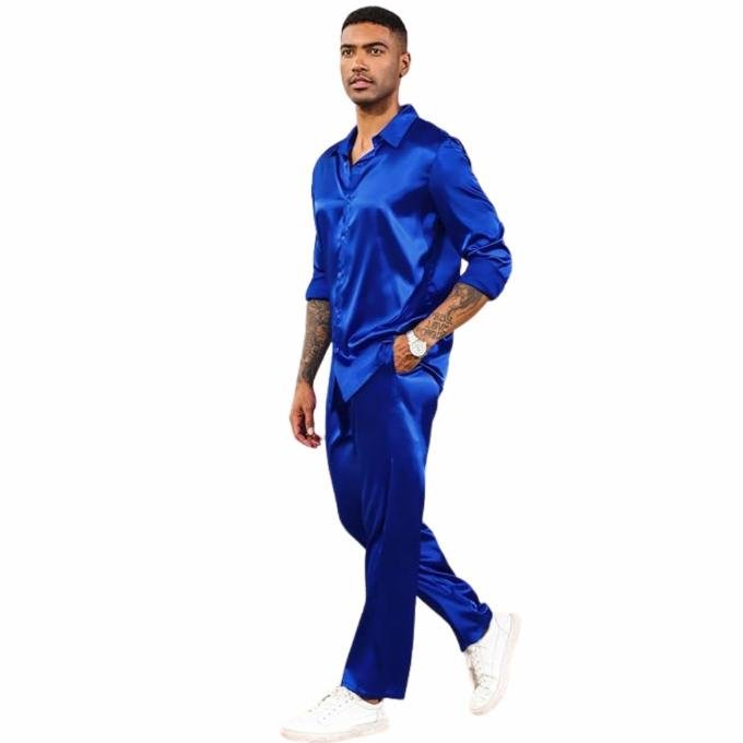 بيجامة رجالية ستان، لون أزرق ملكي، قميص بأكمام طويلة وبنطلون، طقم كامل أنيق
