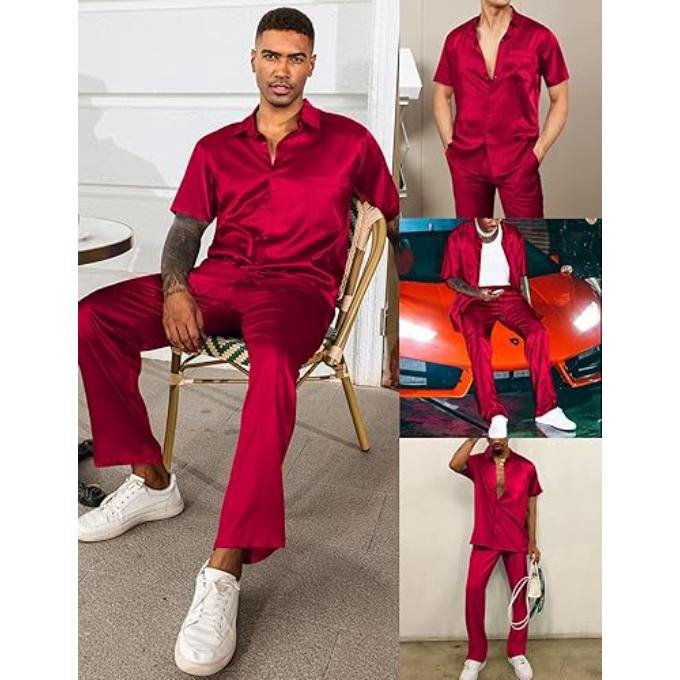 بيجامة رجالية من الساتان، قميص بأكمام قصيرة وبنطلون، مجموعة متكاملة بتصميم أنيق