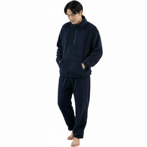 بيجامة رجالية قطعتين من الفرو، لون كحلي، بقلنسوة وسحاب، مريحة للمنزل