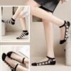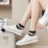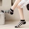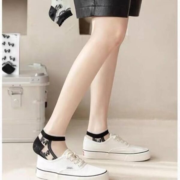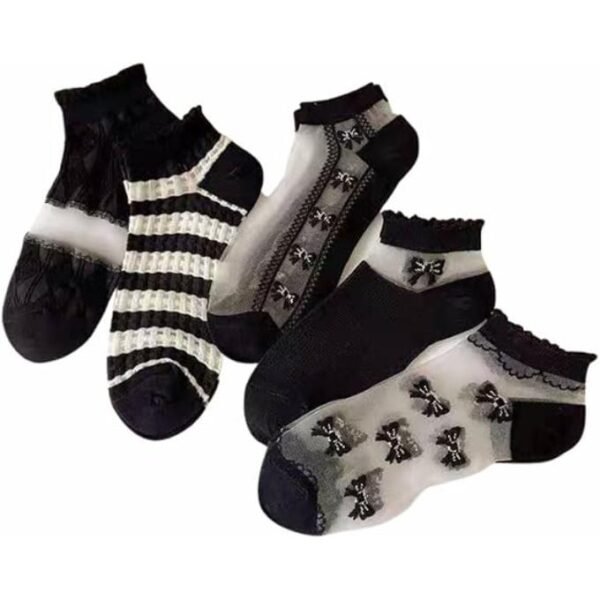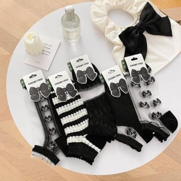 جوارب نسائية شفافة بتصميم مخطط وفيونكات، أسود وأبيض، مجموعة من 5 قطع مع شراب هدية