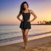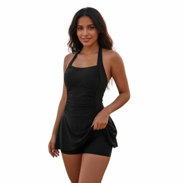 مايوه نسائي شامل الشورت، لون أسود، بتصميم هالتر نيك مع تنورة، للشاطئ والسباحة